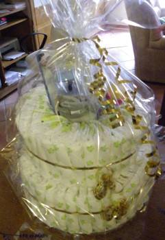 En fait, j'ai mis, donc 1 paquet de couches, 2 bavoirs, 1 set de couverts, 1 biberon, 1 body, et un hochet chenille